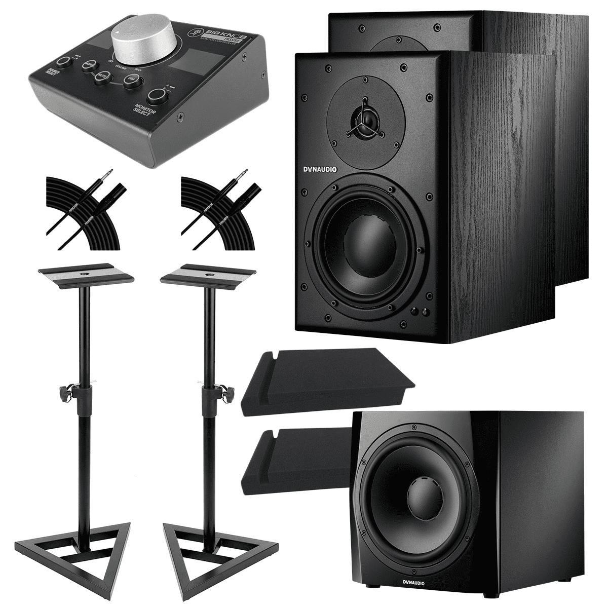 Dynaudio Acoustics BM6A – 2-Way Active (Pair) – Monitor Stands – (2) Mogami Cables – Foam Pads – Mackie Big Knob Passive – Dynaudio Acoustics 9S True Bass